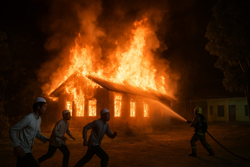 Kebakaran hebat tersebut terjadi pada Jumat (31/10) dini hari di gedung asrama putra lantai dua yang saat itu kosong. Api dengan cepat menjalar hingga ke kantin dan salah satu rumah pembina yayasan.